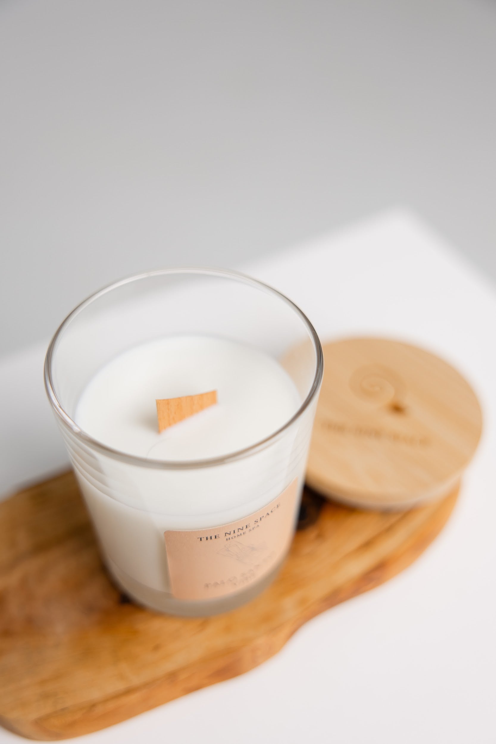 Das klare Glas reflektiert das Licht der Flamme, während der Holzdocht sanft knistert und eine ruhige, tiefe Atmosphäre schafft. Der Holzdeckel kann als Untersetzer genutzt werden und rundet das minimalistische Design perfekt ab.